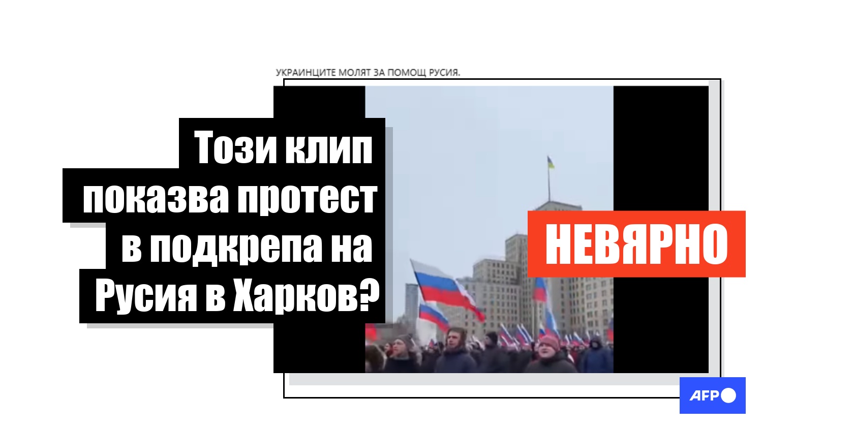 "УКРАИНЦИТЕ МОЛЯТ ЗА ПОМОЩ РУСИЯ", пише Facebook потребител на 1 февруари 2026 г. в пост, към който е прикачено 10-секундно видео. Клипът, гледан над 37 хиляди пъти и споделен от повече от 420 потребители, показва група от хора, които развяват руски знамена и скандират: "Харков, сила. Русия! Помогни!".