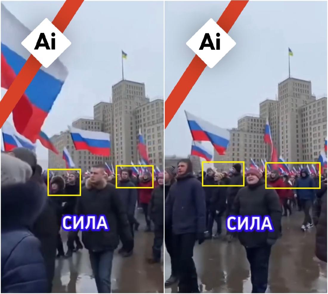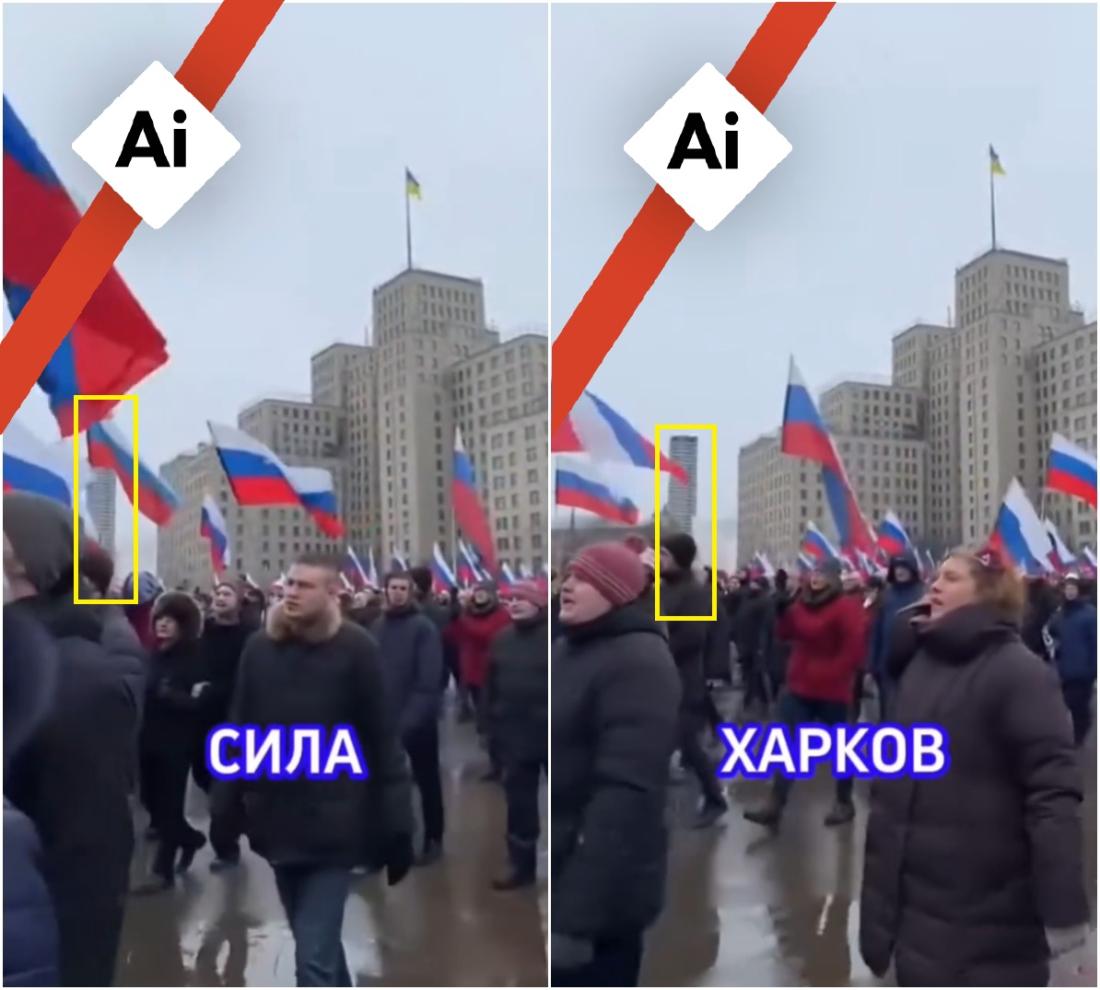 Създадено с AI видео невярно се представя за реални кадри от протест в Харков в подкрепа на Русия