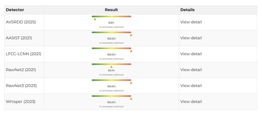 Анализирахме аудиото и с Deepfake-o-meter – проект с отворен код, разработен от Media Forensic Lab към Университета в Бъфало. Софтуерът използва шест системи за разпознаване на синтетичен звук. Четири от тези системи отчетоха 100% вероятност аудиото да е генерирано с изкуствен интелект, докато другите две стойности бяха по-ниски.