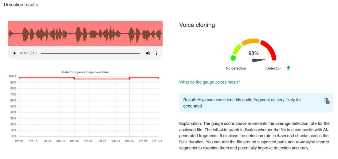 Hiya – инструмент, интегриран в разширението за проверка на фактите InVID-WeVerify, разработено в сътрудничество с AFP – отчете 98% вероятност звукът да е генериран.