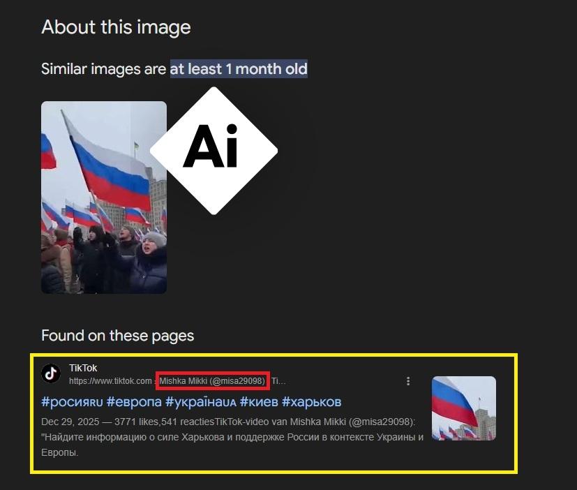 Всичките видеа са разпространени от един и същ TikTok акаунт с име "Misa 29098". Клипът, обект на настоящата проверка, също е разпространен от този профил. Въпреки че към 13 февруари видеото вече не е налично в акаунта, чрез обратно търсене на изображения с кадър от видеото, AFP установи, че клипът все още се индексира към същия профил във функцията на Google "За това изображение".
