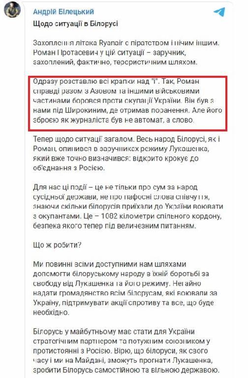 Той е бил там "само като журналист", за да отразява действията на фронта, заяви говорителката на "Азов" Римар на 26 май по електронната поща на AFP . Що се отнася до Билецки, той потвърди в това изявление в канала си в Телеграм, че Протасевич наистина е бил внедрен в неговите войски, но като журналист: "Да, Роман наистина се е сражавал с Азов и други военни части срещу окупацията на Украйна. Той беше с нас близо до Широкин, където беше ранен. Но той беше журналист и оръжието му не беше картечницата, а думите", се казва в изявлението на Билецки.