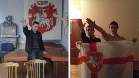 На нито една от тези снимки не е изобразен Протасевич. Снимката вдясно, на която двама млади мъже държат знаме и правят нацистки поздрав, се е разпространявала още през август 2020 г. по време на масовите протести след фалшифицираните избори в Беларус (без да се споменава името на Протасевич).