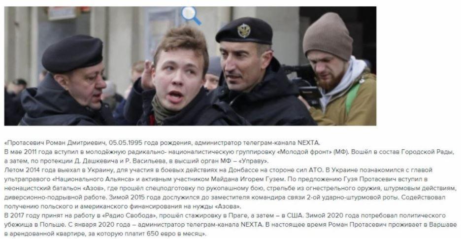 Някои от тези публикации съдържаха откровени лъжи, като например снимки на хора, които са различни от Протасевич; други смесваха истински събития с недоказани или недоказуеми твърдения с цел да подсилят внушението, че той е опасен престъпник, който е трябвало да бъде заловен от беларуския режим.