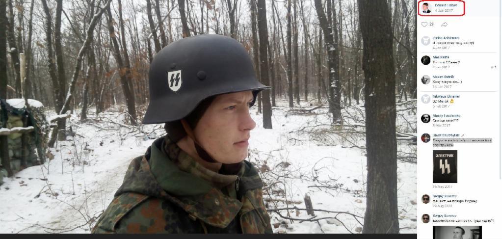 Сред споделените снимки има и една, която показва млад мъж в армейска униформа и с каска, имитираща знака на СС, използван от паравоенните сили Schutzstaffel, действащи по времето на Хитлер в нацистка Германия. На фона на снимката се вижда гора през зимата.