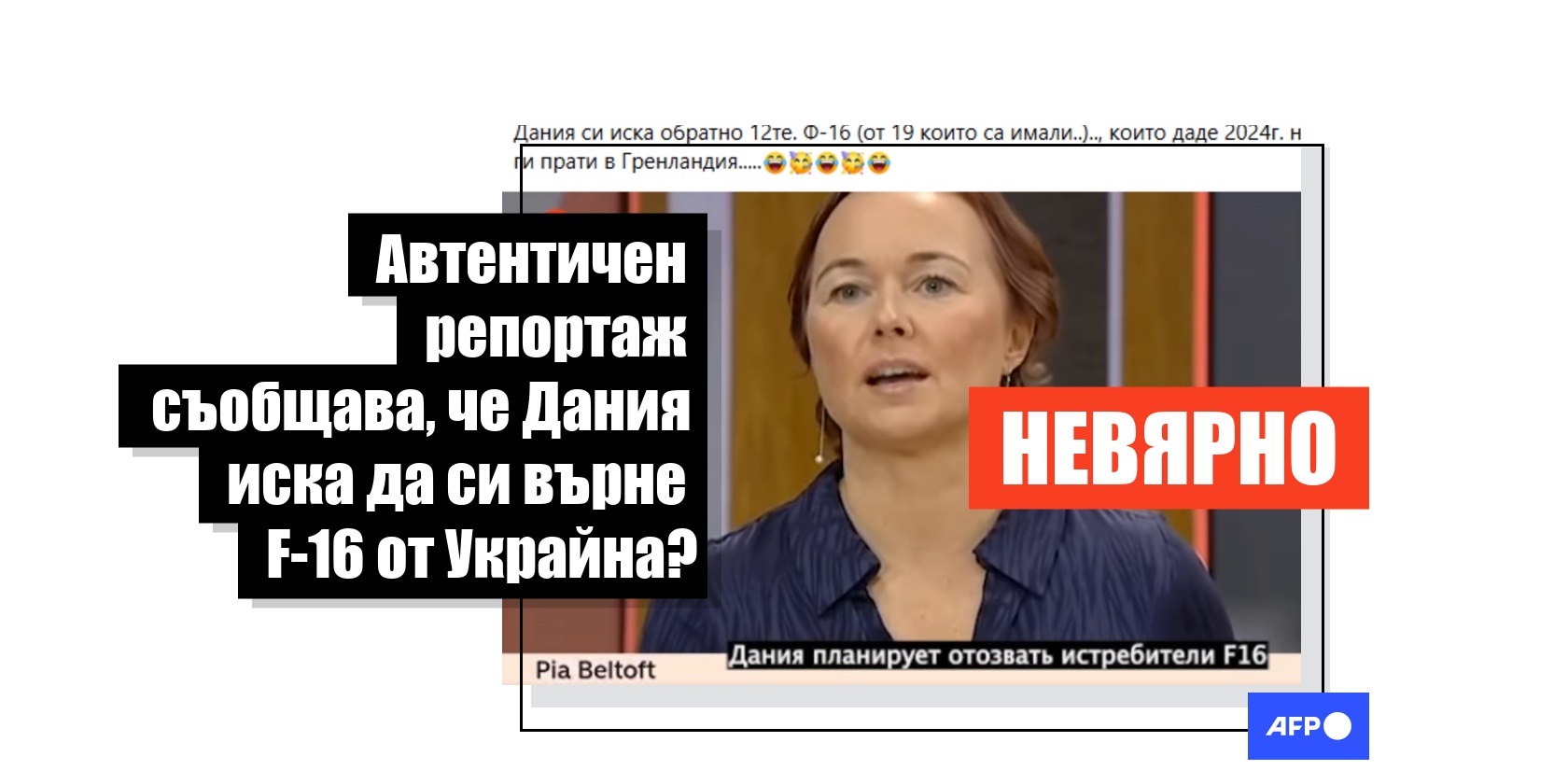 На този фон потребители на социалните мрежи в България споделиха невярно твърдение, че Копенхаген – твърд поддръжник на Украйна във войната с Русия, включително чрез дарения на изтребители – ще поиска от Киев да върне самолетите.