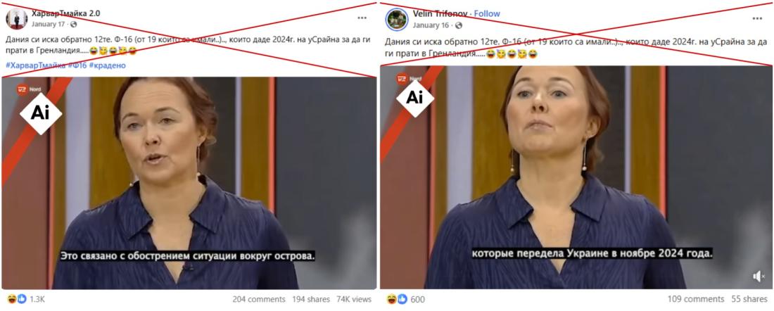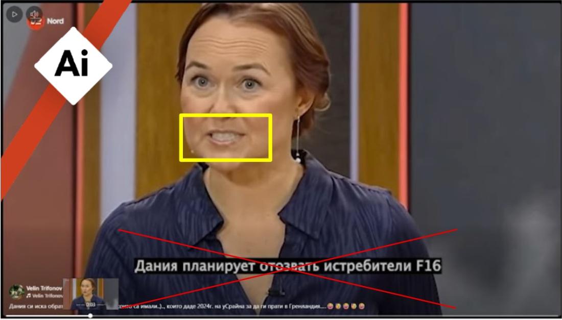 Пълномащабната руска инвазия в Украйна, която продължава вече четири години, предизвика огромна вълна от дезинформация онлайн, често насочена към подкопаване на помощта на западните държави за Киев. В този контекст в средата на януари 2026 г. потребители на социални мрежи в България споделиха видео, представено като репортаж на датската телевизия TV2 Nord, в което водещата уж казва, че Дания ще поиска от Украйна да върне дарените изтребители F-16, за да бъдат разположени в Гренландия. Проверка на Агенция Франс-Прес (AFP) установи, че "новината" е изфабрикувана. Датското Министерство на отбраната отрече да има подобно намерение, а телевизията и водещата заявиха, че такъв репортаж не е излъчван, а клипът е манипулиран с помощта на изкуствен интелект (AI).