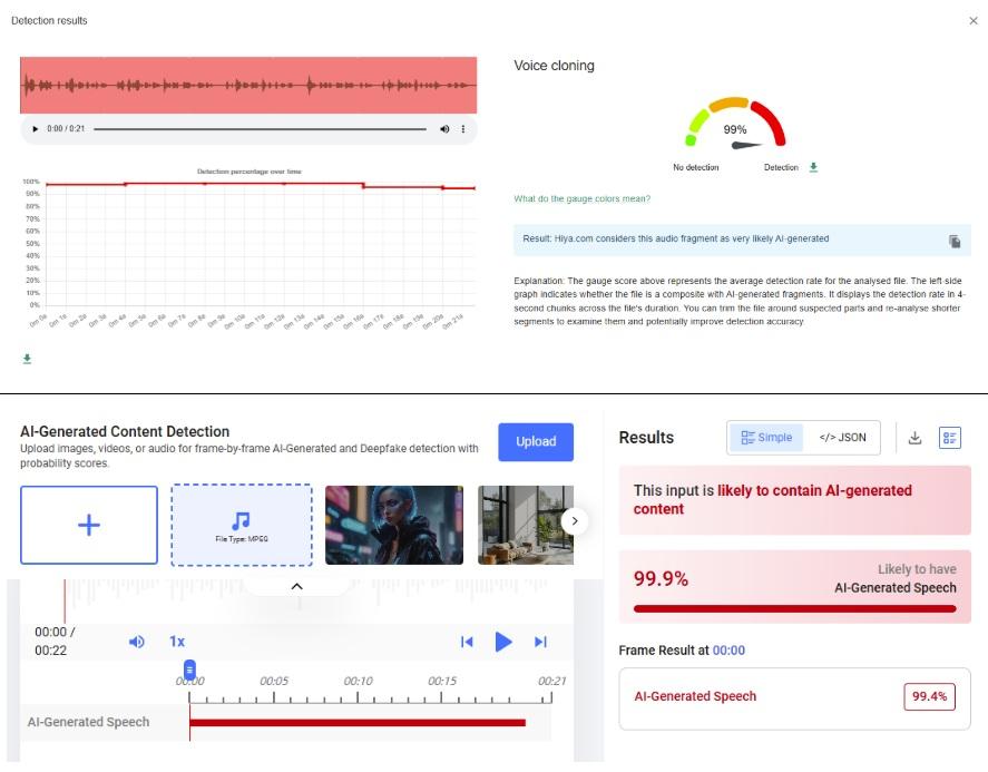 Hiya – инструмент, интегриран в разширението за проверка на фактите InVID-WeVerify, разработено в сътрудничество с AFP – отчете 99% вероятност звукът да е генериран. Проверката с инструмента Hive Moderation също показа 99% вероятност аудиото да е синтетично.
