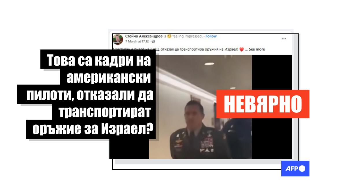 Но видеото, споделяно в социалните мрежи, не показва американски пилоти, арестувани за отказ да транспортират оръжия до Израел, и няма връзка с настоящия конфликт.