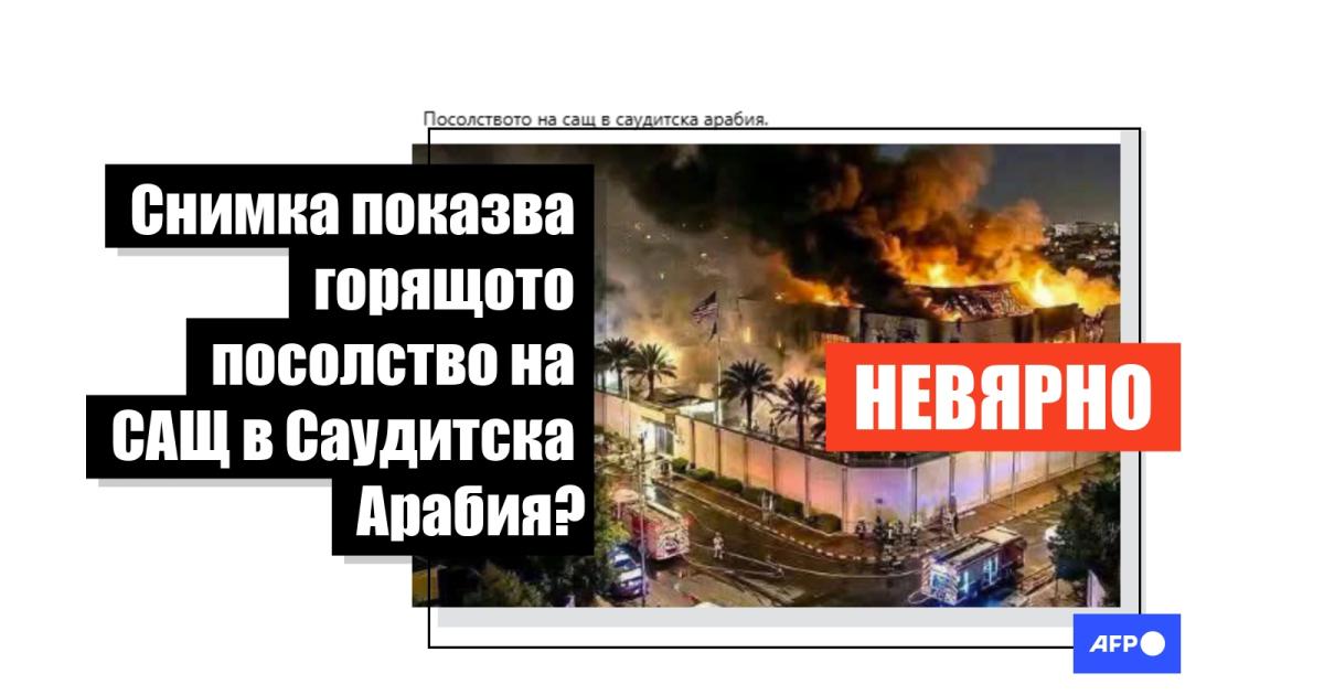 "Посолството на сащ в саудитска арабия", гласи Facebook пост от 3 март 2026 г., споделящ изображение, на което се вижда обхваната от пламъци сграда, от която излиза черен дим. Около сградата се виждат пожарни автомобили.