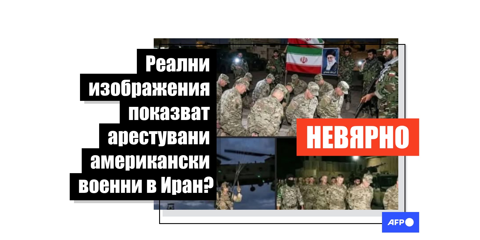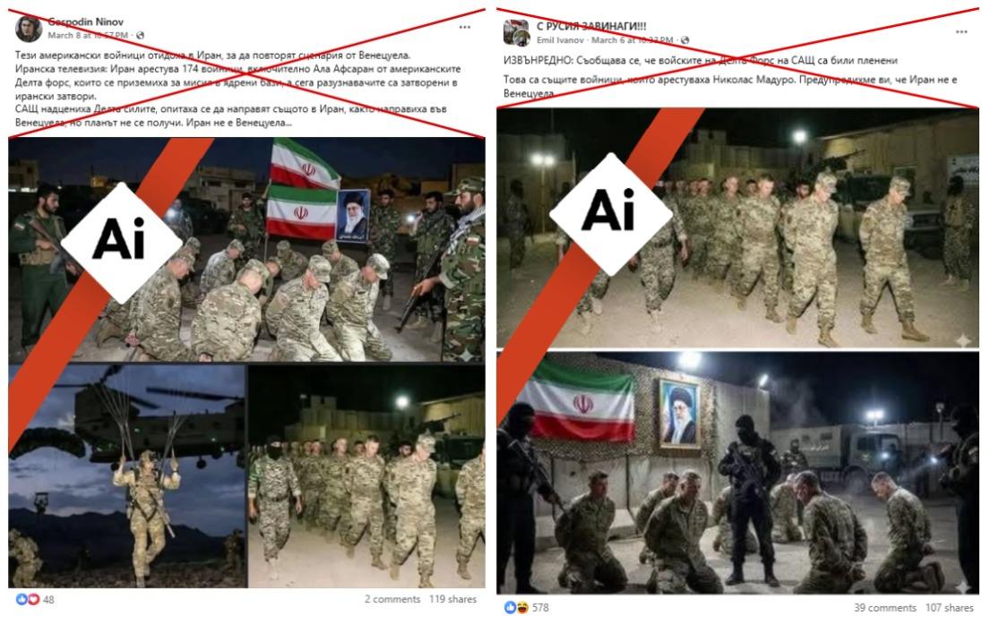 В двата колажа, които циркулират на български, са включени общо четири изображения, които сякаш показват пленени американски военни в Иран. На три от изображенията се виждат войници в камуфлажни униформи с вързани ръце зад гърба, а на четвъртото – войници, които са скочили с парашути от хеликоптер.