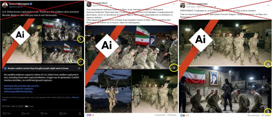 "ИЗВЪНРЕДНО: Съобщава се, че войските на Делта Форс на САЩ са били пленени. Това са същите войници, които арестуваха Николас Мадуро. Предупредихме ви, че Иран не е Венецуела", гласи друга публикация от 6 март 2026 г., съдържаща колаж от две изображения, като едно от тях се повтаря и в двата колажа. Същият колаж и текст се разпространяват от други потребители, например тук и тук. Постовете, до които достигна AFP, са споделени общо над 230 пъти.