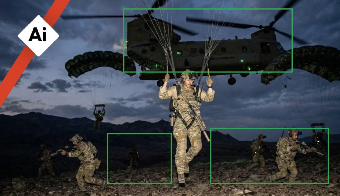 В изображението с парашутистите хеликоптерът изглежда лети прекалено ниско за скок с парашут, а на земята зад уж вече приземилите се парашутисти няма следи от парашути.