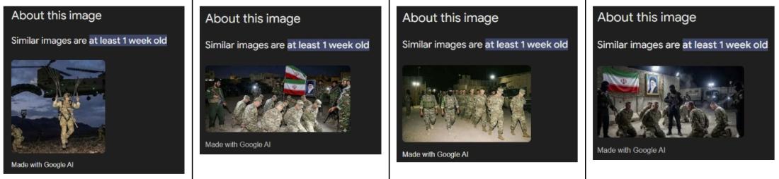 Въпреки че президентът на САЩ Доналд Тръмп заяви, че на този етап няма да изпраща сухопътни войски в Иран, в началото на март 2026 г. в социалните мрежи започнаха да се разпространяват снимки, представяни като кадри с американски войници, пленени от армията на Ислямската република. Агенция Франс-Прес (AFP) провери изображенията и установи, че те са генерирани с изкуствен интелект (AI), за което свидетелстват визуални несъответствия. Google разпозна изображенията като генерирани с AI инструментите на компанията.