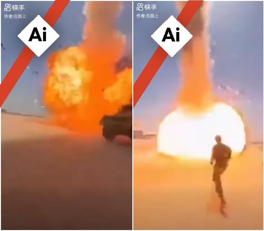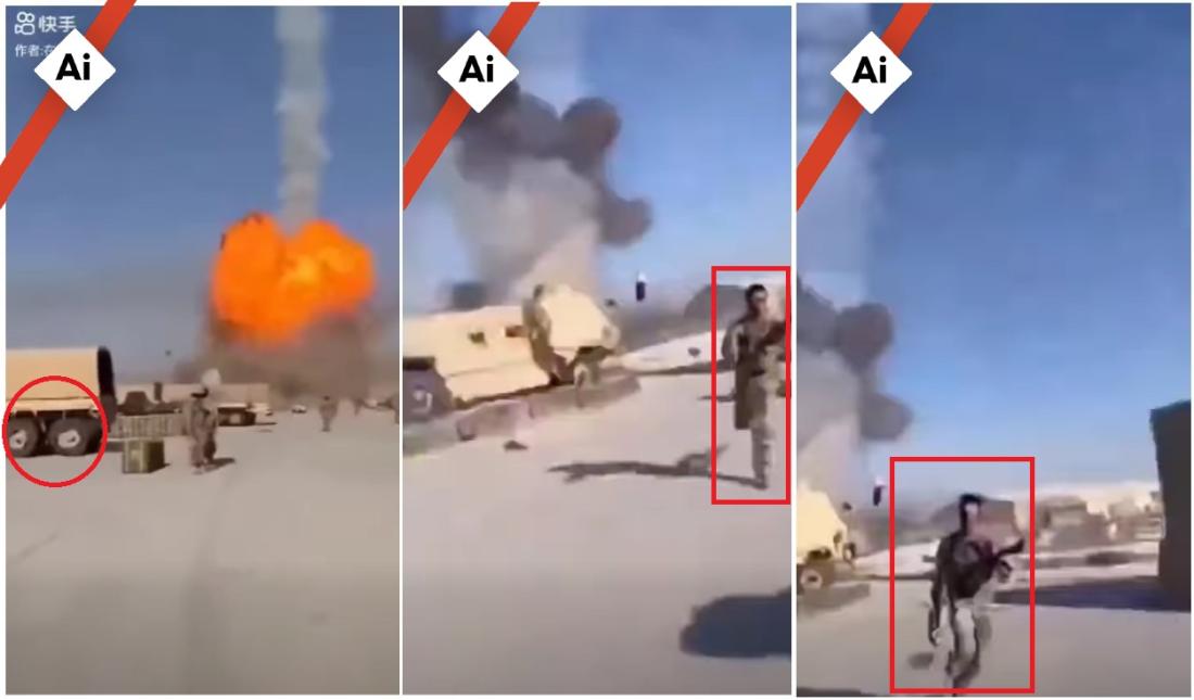 В дългата версия на видеото, споделяно с твърдението, че показва подложена на удари американска база, се виждат войници, които бягат, за да се укрият, и се чуват викове на английски като "идва удар" и "продължавайте". AFP анализира аудиото с два инструмента, предназначени за откриване на съдържание, създадено с изкуствен интелект.