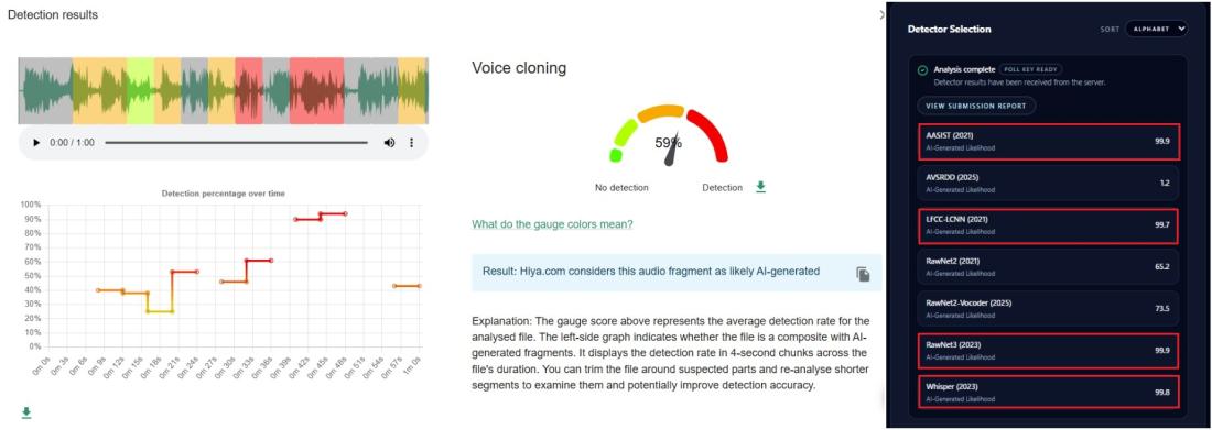 Първо проверихме аудиото с Hiya – инструмент, интегриран в разширението за проверка на фактите InVID-WeVerify, разработено в сътрудничество с AFP. Hiya отчете висока вероятност звукът да е синтетичен – 59%. В тази публикация от ноември 2025 г. Дени Тейсу, ръководител "Иновации" по проектите InVID и WeVerify в AFP, обяснява, че подобен резултат се смята за висок, тъй като ако един аудиофайл е автентичен, "той няма да съдържа следи от генериране с изкуствен интелект".