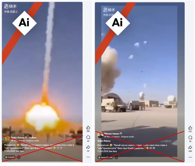 "Китай пусна скрити кадри, какво наистина става в "хам*ериканските" 6ази при бомбардировка", пише във Facebook публикация от 11 март 2026 г. Постът съдържа 60-секундно видео, на което се вижда как ракети се взривяват на място, приличащо на военна база, докато хора в камуфлажни униформи бягат и приканват други да се укрият от ударите.