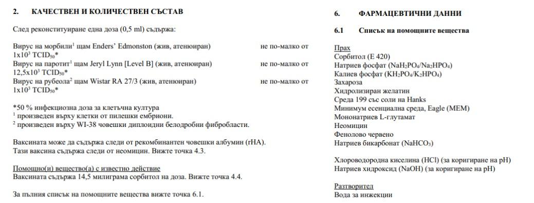 Но съставът на ваксините, одобрените употреби, предупрежденията и известните нежелани реакции се публикуват в официалната информация за продукта, прегледана от регулаторните органи за лекарства. За M-M-RvaxPro Европейската агенция по лекарствата предоставя тази информация на обществено разположение, включително списък със съставките и известните странични ефекти: