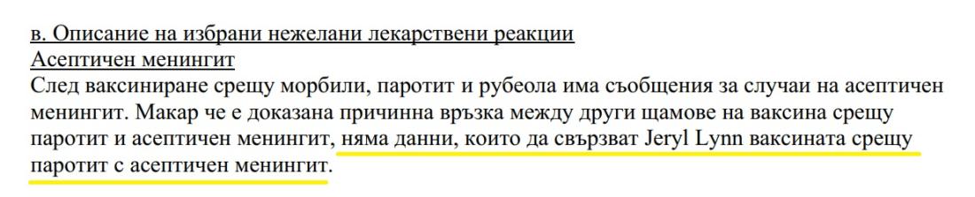 Въпреки че настоящата информация за продукта на Европейската агенция по лекарствата за ваксината M-M-RvaxPro, използвана в България, посочва "асептичен менингит" сред нежеланите реакции с "неизвестна честота", в нея се посочва, че "макар че е доказана причинна връзка между други щамове на ваксина срещу паротит и асептичен менингит, няма данни, които да свързват Jeryl Lynn ваксината срещу паротит с асептичен менингит":