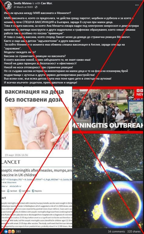 През март 2026 г. българските здравни власти обявиха извънредна ваксинационна кампания, след ръст на случаите на морбили и спад на обхвата на имунизацията през последните години. В този контекст публикации в социалните мрежи, споделени стотици пъти, погрешно внушават, че ваксината MMR, която предпазва от морбили, паротит и рубеола, е опасна и причинява аутизъм и менингит. Експертите и здравните власти обаче са категорични, че няма достоверни доказателства за връзка между тази комбинирана ваксина и аутизма. Твърдението за менингита се основава на старо проучване, свързано с щам на паротит, който вече не се използва в настоящите MMR ваксини. Информацията за съставките и безопасността на одобрените ваксини е публична и се проверява от регулаторните органи.