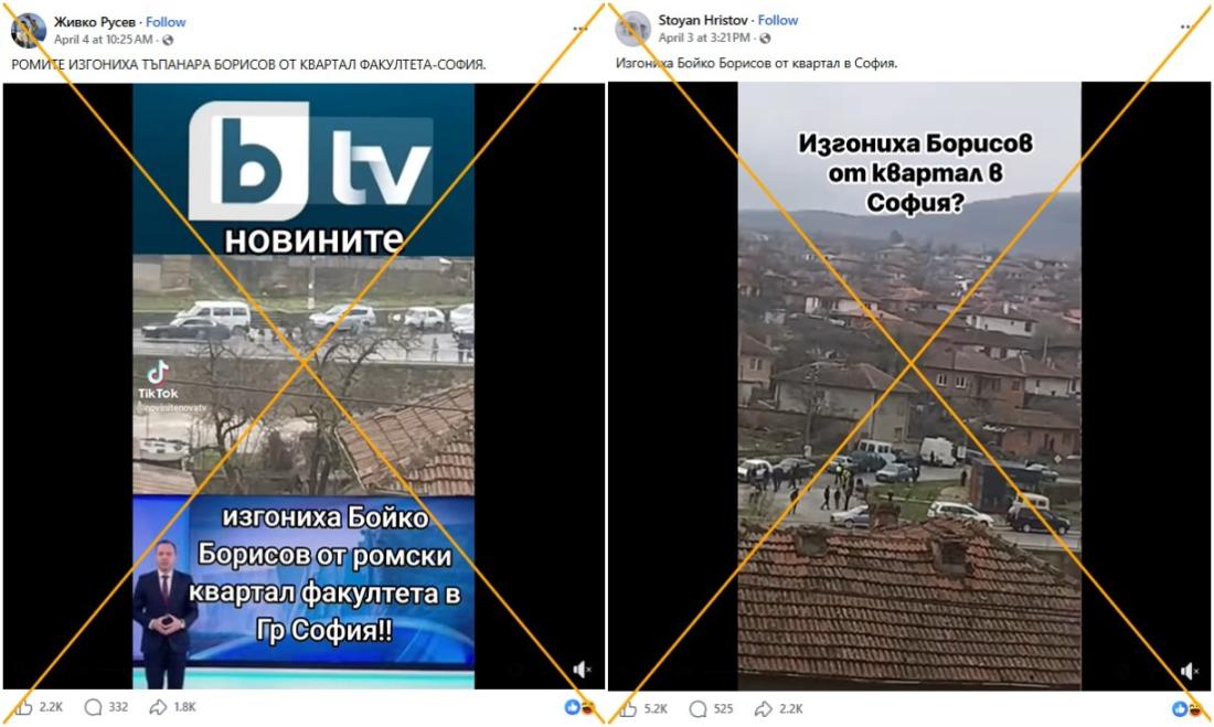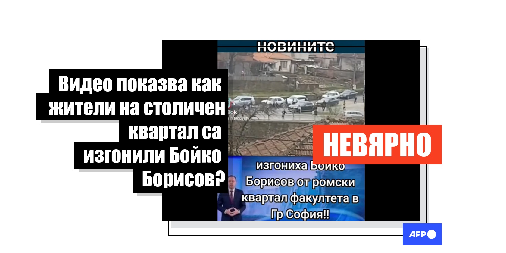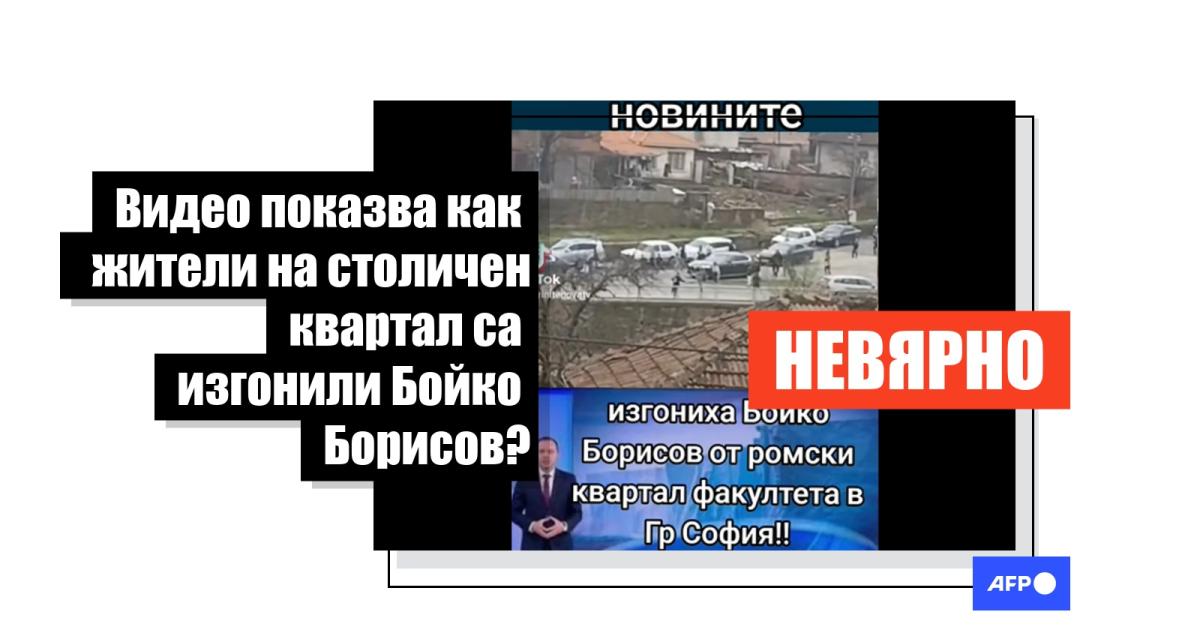 В България тече предизборна кампания за предсрочните парламентарни избори, насрочени за 19 април 2026 г. Това ще бъде осмият парламентарен вот в страната за последните пет години – период, белязан от политическа нестабилност в страната. В този контекст публикации в социалните мрежи, споделени хиляди пъти, разпространяват видео с твърдението, че то показва как лидерът на ГЕРБ Бойко Борисов е "изгонен" от софийски квартал. Един от Facebook постовете използва логото на националната телевизия bTV и кадър на неин журналист в студио. Проверка на AFP обаче установи, че кадрите всъщност са заснети по време на посещението на Борисов в село Градец, на около 350 километра от столицата, а от bTV заявиха, че нито са излъчвали клипа, нито са изпращали екип на мястото. AFP не успя независимо да потвърди дали кадрите действително показват как Борисов е бил "изгонен".
