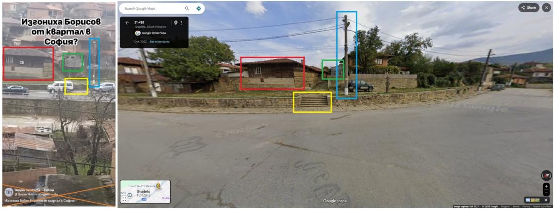 На сравнението по-долу между екранна снимка от разпространяваното видео и екранна снимка от Google maps се виждат: една и съща къща; стълби, водещи от главния път към уличка до къщата; същият електрически стълб; както и същата сграда зад стълба, която прилича на оранжерия.