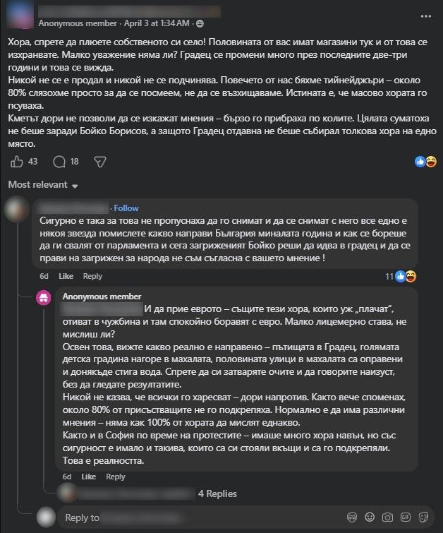 Прегледахме също така и публикации в Facebook групи, носещи името на село Градец – тук и тук. Някои от публикациите в тези групи изразяват възмущение от начина, по който Борисов е бил посрещнат по време на посещението, например тук. В една публикация и коментарите под нея анонимен потребител твърди, че към края на посещението тълпата е отправяла обиди към Борисов.