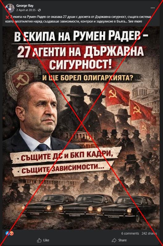 В нея се споделя списък с имена на спортисти, политици, изследователи, историци, артисти и др. и тяхната предполагаема връзка с бившите комунистически тайни служби. Към публикацията има изображение, показващо бившия президент Радев, знамена на СССР, волги и силуети на мъже.