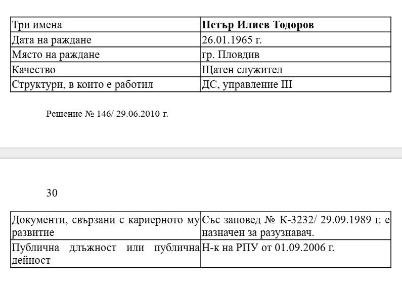 Решението показва, че в листите на "Прогресивна България" на Радев има един кандидат, свързан с бившата ДС — бившият главен секретар на Министерството на вътрешните работи Петър Тодоров. Той е бил назначен като щатен разузнавач в III управление на Държавна сигурност (военно контраразузнаване) в Пловдив през септември 1989 г., около месец преди падането на тоталитарния режим.